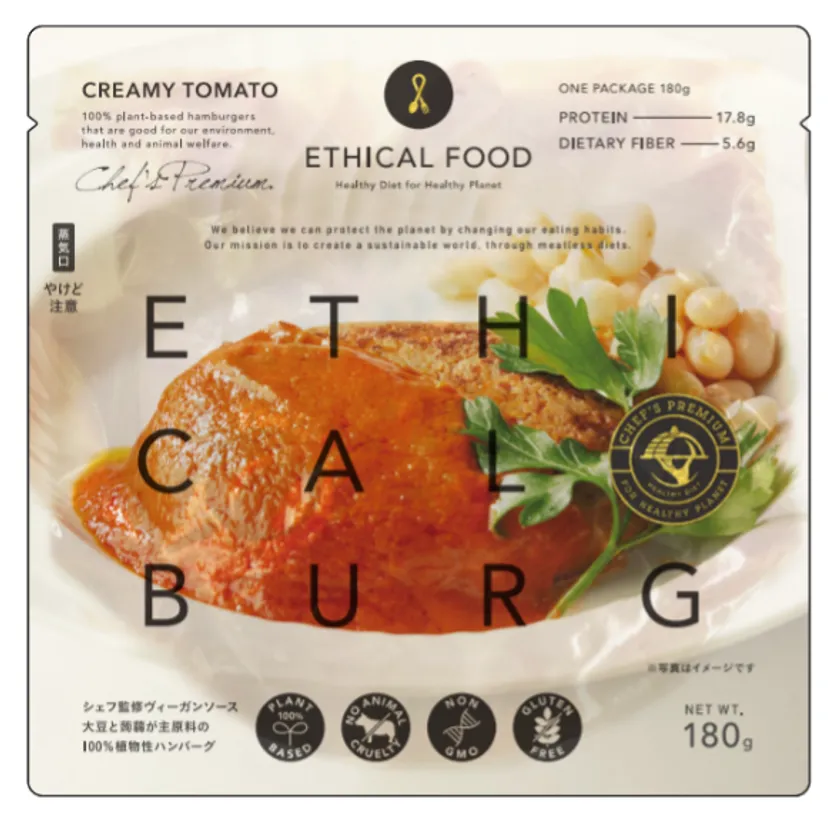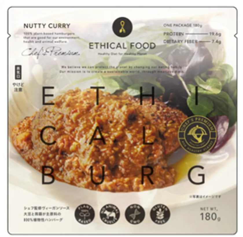 エシカルフード株式会社(所在地:東京都中央区銀座7-13-5)は、「これからの食のスタンダードを創り出し、よりよい未来を次の世代へ紡いでいく」というミッションを掲げ、2021年6月に設立されました。このたび、エシカルフード株式会社が、群馬の老舗こんにゃくメーカー茂木食品工業株式会社と共同開発した100%植物性の「ETHICAL BURG(エシカルバーグ)」をベースに、人気イタリアンレストラン、ブリアンツァグループのオーナーシェフ、奥野義幸氏が監修した特製ヴィーガンソースを合わせたETHICAL BURG Chef's Premium(エシカルバーグ シェフズ・プレミアム)シリーズをアタラシイものや体験の応援購入サービス「Makuake」にて2022年4月27日より、先行発売する運びとなりました。今回発売するのはスパイシーで食欲をそそるカレーソースとこだわりのトマトソースの2種類のラインナップです。
