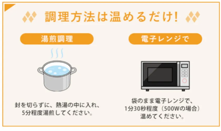 ・袋のまま、お湯やレンジで温めるだけ!一流シェフの一皿がご自宅で気軽に楽しめます。