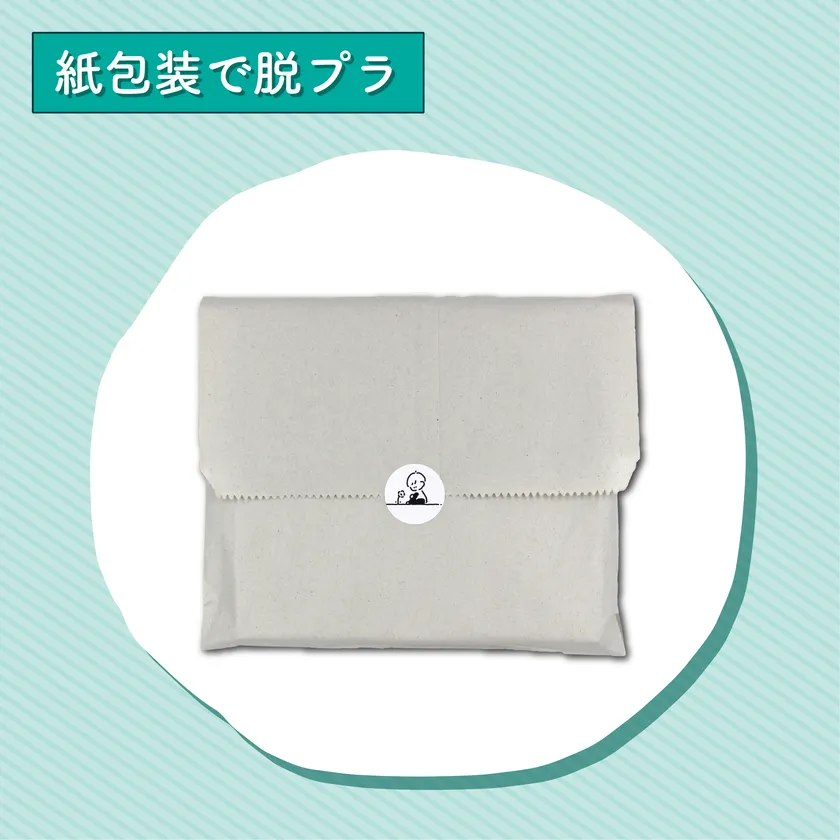 当社は脱プラスチックを推奨しており、一つ一つ丁寧に紙袋にて商品が傷まないように梱包いたします。ゆるかわキャラクター「三頭身」のシールがワンポイントになっています。