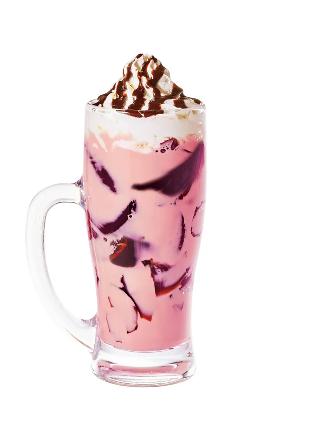 自家製コーヒージェリーにフルーティなルビーショコラソースとエスプレッソソースを加え、ホイップクリーム、チョコレートソースで仕上げました。ルビーチョコレートソースの上品な甘さと、自家製コーヒージェリーのほどよい苦みの相性はぴったりです。ちょっと大人な味わいの「ルビーショコラ」は、太めのストローでよく混ぜてお召し上がりください。