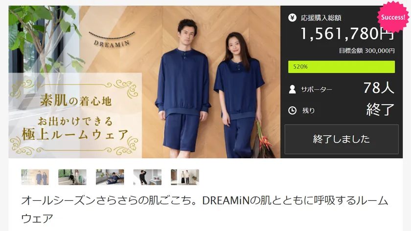 Makuakeで目標を520%達成した オールシーズンさらさらの肌ごこち 「お出かけできるDREAMiN(ドリーミン)の極上ルームウェア」 いよいよ4月22日発売開始!