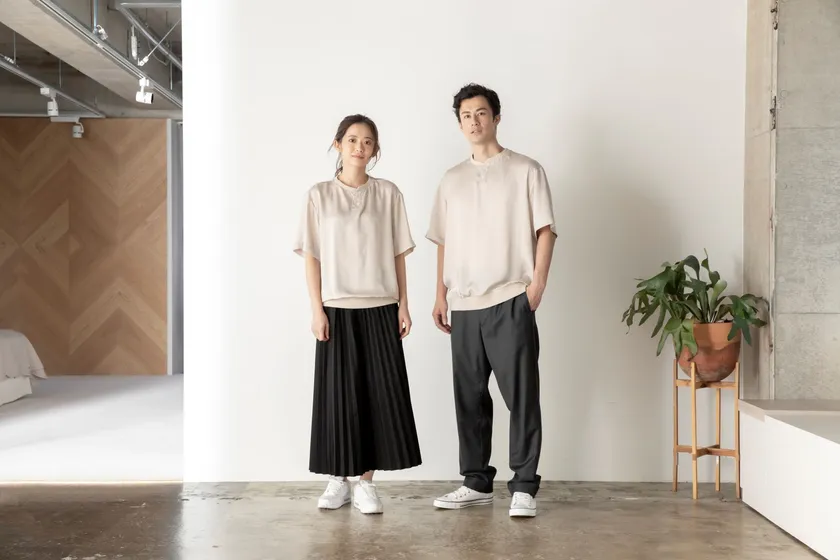 世界の“眠り”を変えるために、老舗繊維メーカーが寝心地と着心地を徹底追求し開発した布。それを後加工によりアップグレードし、しっとりさせました。また、男性にも女性にも、そしてシーンを選ばず着られるよう考慮したデザインに仕上げています。