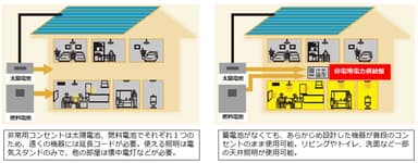 停電時でも太陽電池・燃料電池・蓄電池の3電池連携システムであれば、日常に近い形で生活ができます。しかし、太陽電池と燃料電池のみの場合、従来は停電時に非常用コンセントしか使うことができず、機器の移動や延長コードが必要でした。今回新設した停電時電力供給盤を介することによって、蓄電池がなくてもあらかじめ設計した機器(冷蔵庫、テレビ、電子レンジなど)が普段のコンセントのまま使用可能になります。また、一部の天井照明も使用可能です。