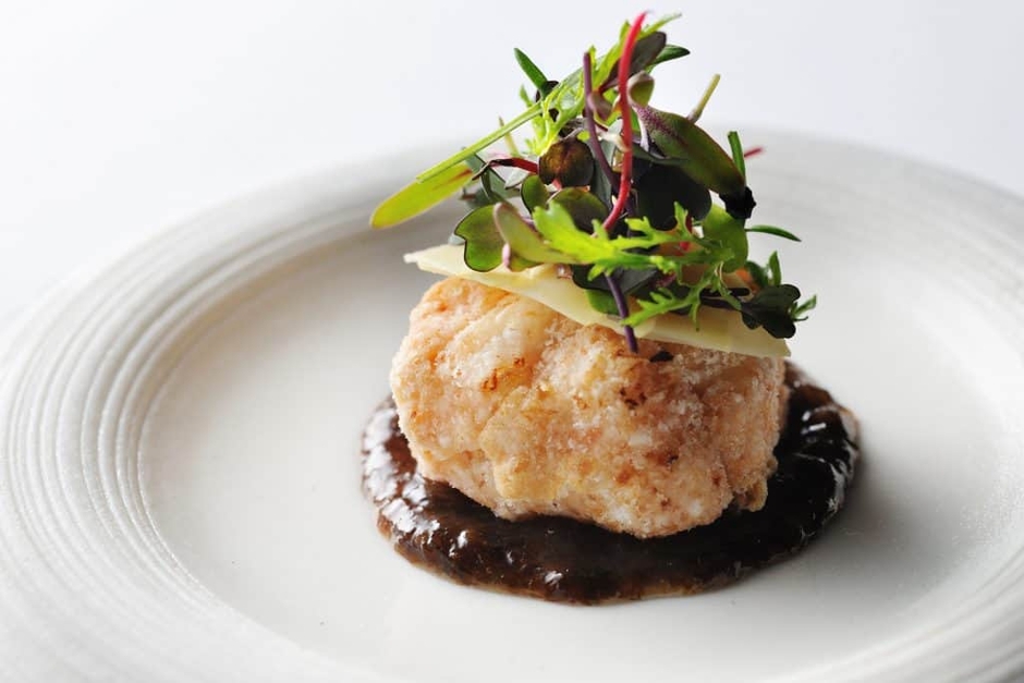 春になるとお花見に欠かせない食材として青森県で親しまれてきた栗蟹を贅沢に丸ごと使用した一皿です。蟹のみそや殻を余すことなく濃厚なビスクに仕上げ、スパイシーな軍鶏肉を合わせました。柔らかく甘みのある蟹のほぐし身と脂の香りが濃厚な軍鶏肉は相性ぴったりです。重厚ながらもアブサンの香りで後に引かないさわやかな味わいが楽しめます。