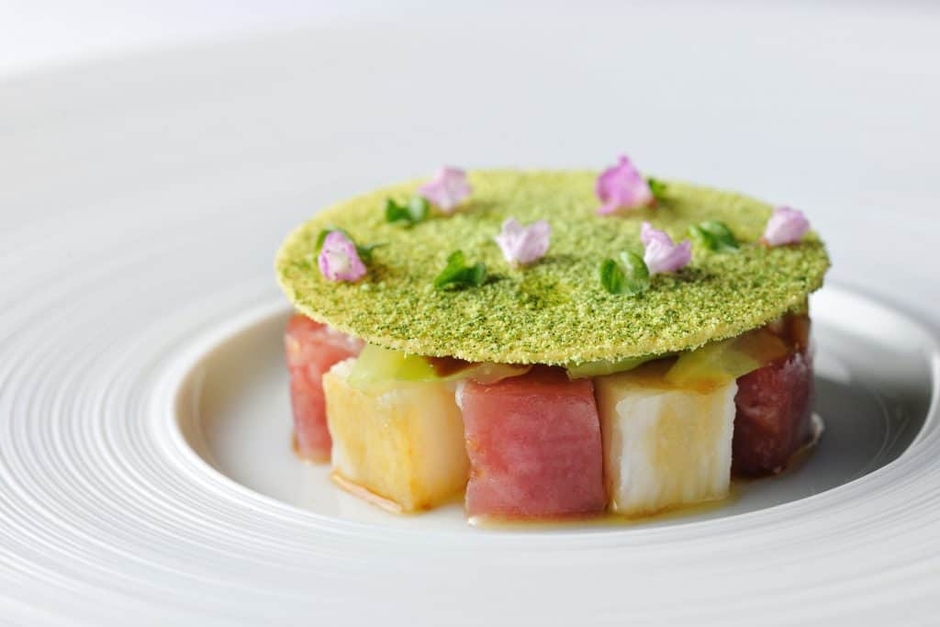 少し大きめにカットした鮪と旬の春キャベツを合わせた一品です。春キャベツの甘味がほのかに香るチュイルの下には、特製の魚醤のタレを使った鮪と火入れした長芋、鶉卵の温玉を合わせました。長芋にしっとりと火を入れることで、柔らかい食感の長芋と鮪の食感がぴったりと調和します。温玉がとろりと絡み合いまろやかな味わいも楽しめます。キャベツのチュイルをアクセントに添え、噛むごとに鮪とキャベツの香りと余韻が引き立つ一皿です。