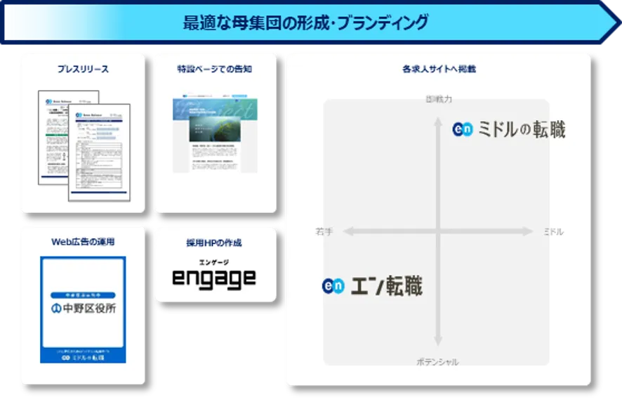 プレスリリースや特設ページ、採用HPの作成、Web広告での告知に加え、各求人サイトでの集客サポートを実施いたします。『エン転職』『ミドルの転職』とターゲットの異なる求人サイトを活用することで、ターゲットへ網羅的に求人を届けます