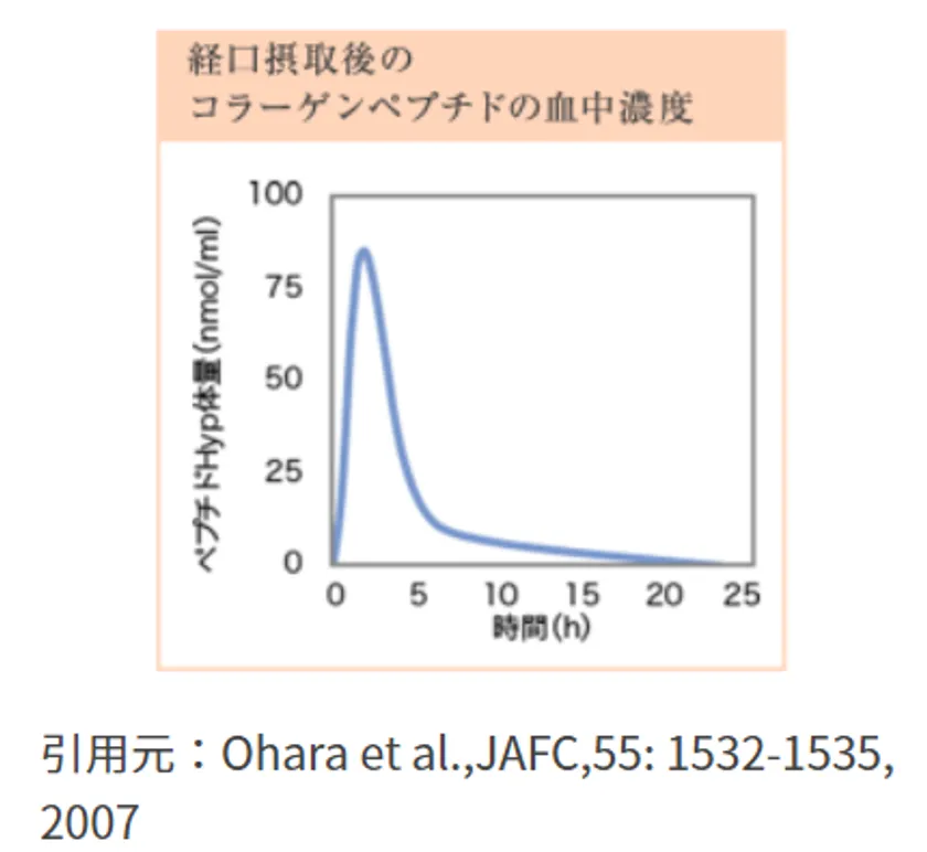 経口摂取したコラーゲンペプチドは、残念ながら24時間後には血中からなくなってしまうことがわかっています。毎日摂ることで常に体内にコラーゲンペプチドをキープすることが大切です。