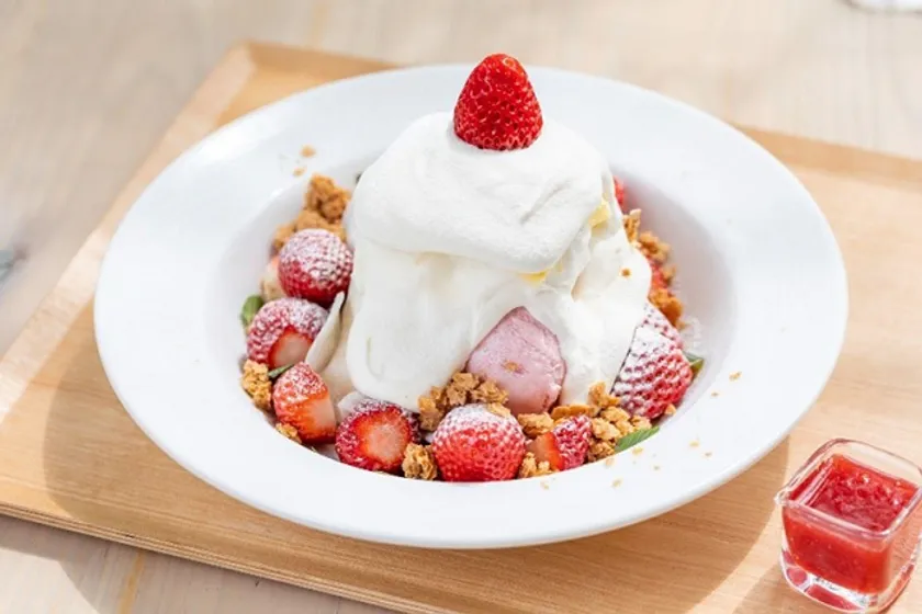 もちふわ食感とジューシーないちごが楽しめる、可愛い見た目の皿パフェです。とろふわクリームの下には、もちもちのお餅シート、いちごとミルクのアイスクリームが隠れており、ボリュームも満点。甘酸っぱいいちごソースをかけてお召し上がりください。