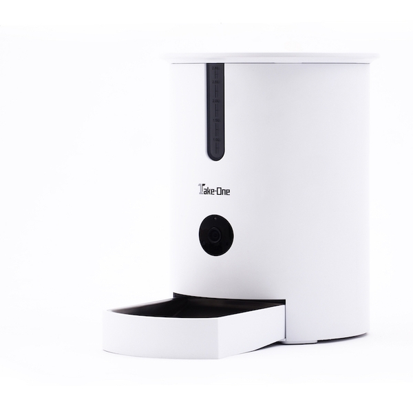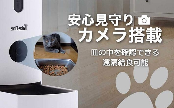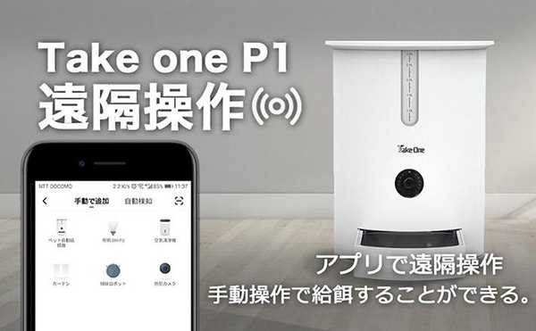 Take-One HomeスマホアプリからWi-Fiを繋げることで、スマホアプリから自動でペットに餌を与え、食べている様子はカメラから確認可能です。搭載されたスピーカーを通して、ご自宅のワンちゃんネコちゃんに呼びかけることもできます。
