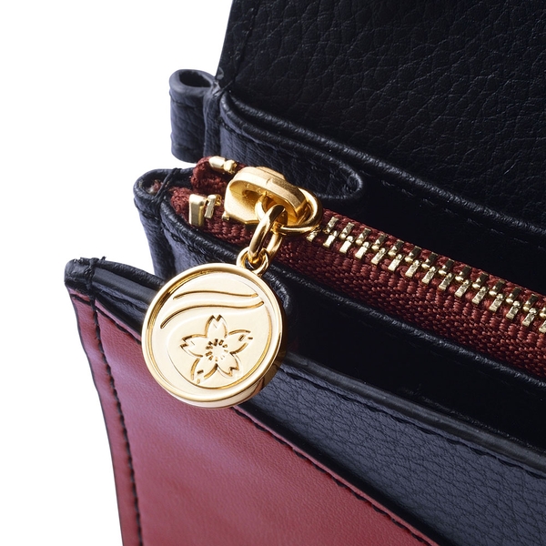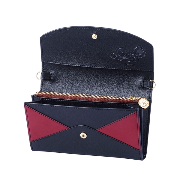 内装は織田のコスチュームをイメージした柄をベースに機能性のある仕切りポケット、蓮の花と歯車をさりげなく型押ししました。