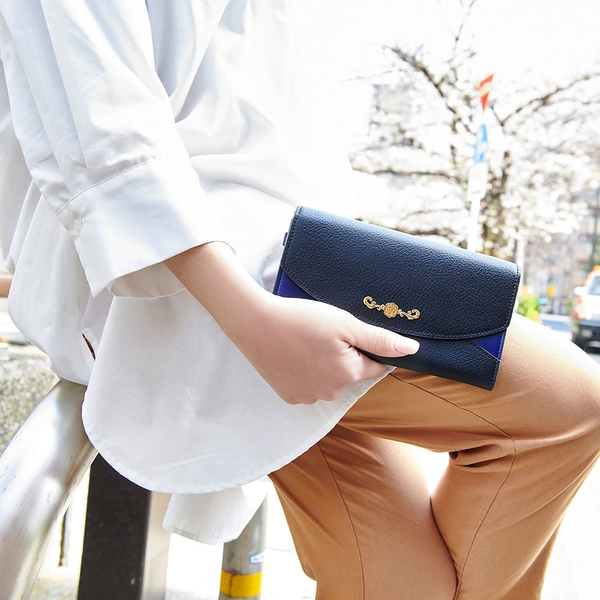 内装は坂口のコスチュームをイメージした柄をベースに機能性のある仕切りポケット、蓮の花と歯車をさりげなく型押ししました。