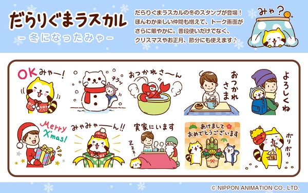 日本アニメーショングループの日本アニメ企画株式会社(本社:東京都中央区、代表取締役社長:石川和子)がライセンス管理を行う「だらりぐまラスカル」のLINEスタンプ「だらりぐまラスカル –冬になったみゃ-」の配信を本日2021年12月16日(木)より、LINEクリエイターズマーケットにて開始いたしました。