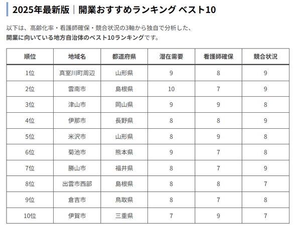 2025年6月、医療・介護事業者向けの経営支援を行う4X株式会社(東京都渋谷区 ※以下4X)は、独自に収集・分析した全国の市区町村別データをもとに、訪問看護ステーションの開業に適した地方自治体ランキング「2025年最新版|開業おすすめランキング ベスト10」を発表しました。