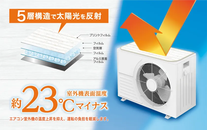 この【マグネット式 エアコン室外機用遮熱カバー】は、5層構造の遮熱シートで室外機をカバーすることで太陽光(日射)を反射し、エアコン室外機の温度上昇を抑え、運転の負担を軽減します。
