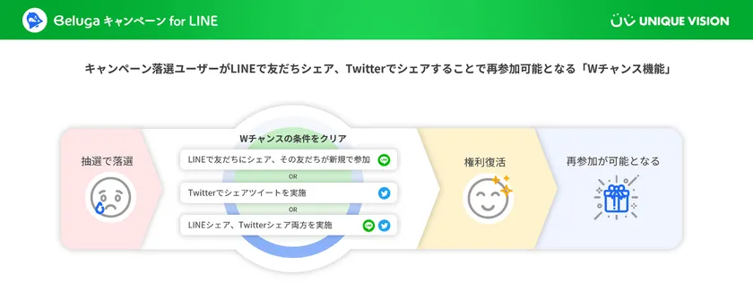 TwitterシェアやLINEの友だちにシェアで Wチャンスの権利を獲得! ユニークビジョン、LINE向けの キャンペーンツールにWチャンス機能を追加