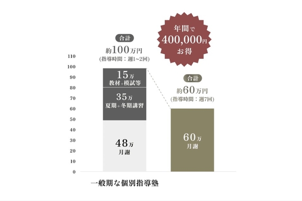 指導時間は一般的な学習管理塾の約7倍〜21倍にあたる「週21時間(毎日3時間)」を確保しながら、費用面では年間約40万円のコストダウンを可能にしました。