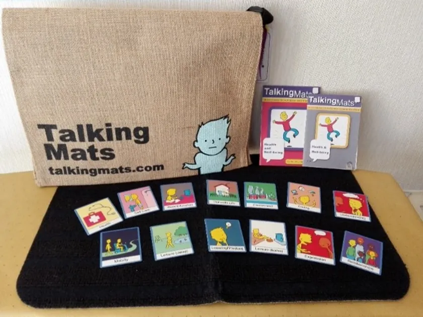 トーキングマット(R)(Talking Mats)は、1998年に、英国スコットランドのスターリング大学の研究者が開発した、本人が大切にしている思いや希望を知り、お互いに分かち合うための支援ツールです。現在は、認知症高齢者、学習障害・知的障害のある人、その他記憶保持やコミュニケーション等に支障がある方に対する支援策として活用されており、余暇、仕事、教育、健康、食事、人間関係、子ども、安全、終末期など様々なテーマが用意されています。