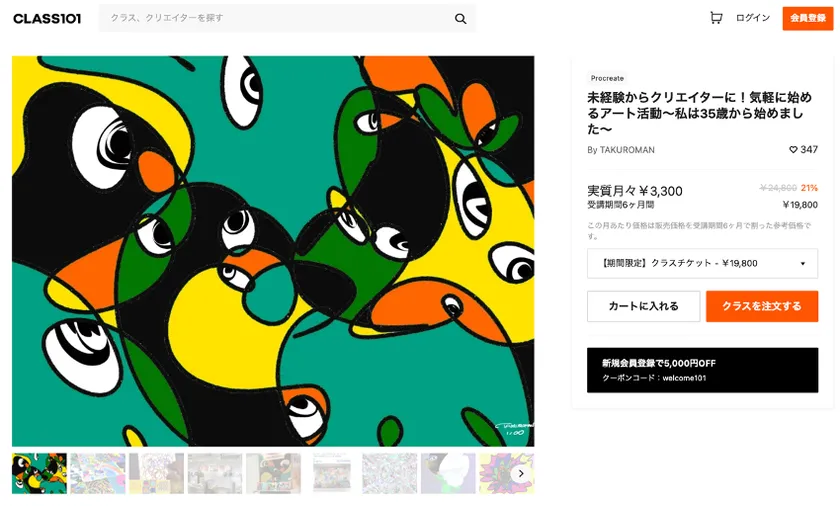 CLASS101には「アート作品を描く」クラスは多くありますが、TAKUROMANさんのクラスは「アーティスト活動を始める・続ける」部分にまで焦点をあてた、新しいコンセプトのクラスです。「受講生のチャレンジを後押ししたい」というTAKUROMANさんの熱い気持ちが伝わる、とても素敵なクラスになっていますのでぜひお楽しみください。