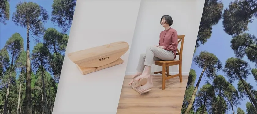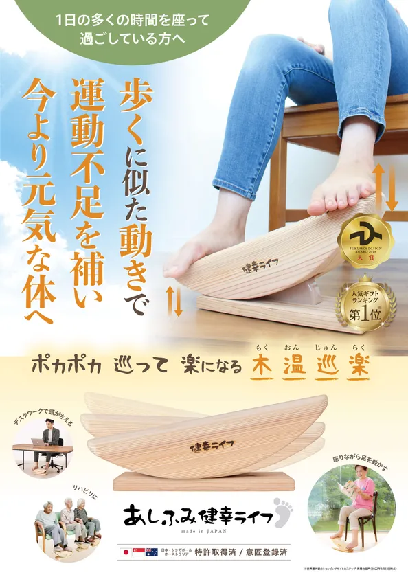 「あしふみ健幸ライフ」は、日本初の「座位歩行器」で、貧乏ゆすりの感覚で長時間リズミカルなあしふみ運動ができる運動器具です。電気やモーターを使用しない簡単な構造で、筋力が弱い高齢者でも、座ったままの姿勢で、楽に貧乏ゆすり(ジグリング)に似た動きができます。足を左右の端にのせ、5分で約1,000回ウォーキングのような運動ができます。