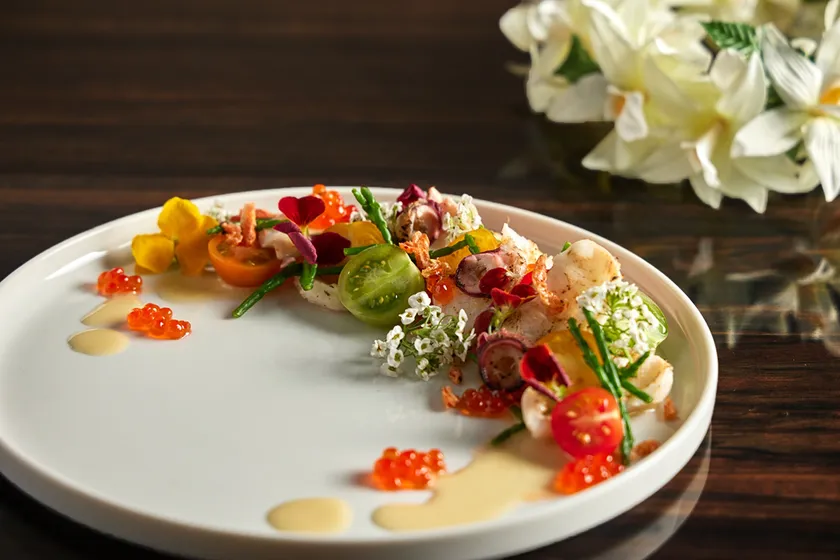 マリネしたタコをさっとグリルし生姜や柚子をアクセントにした白味噌のヴィネグレットソースで