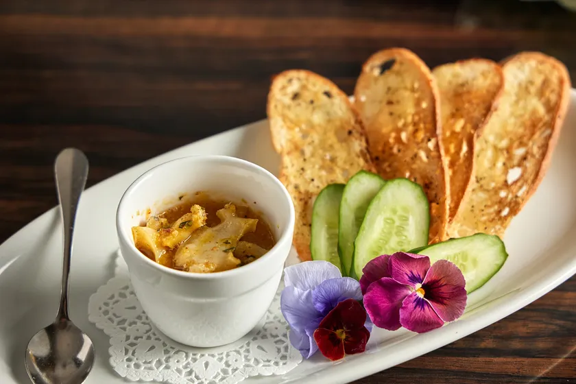 アワビとハワイアンチリペッパーバターのココット ハニートースト添え