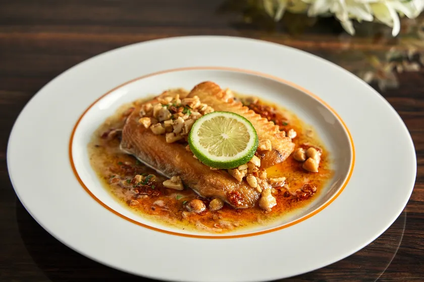 ソテーした銀ダラを、マカデミアナッツとライムジュースを入れた焦がしバターのソースで ハリッサをアクセントにスパイシーに仕上げました。