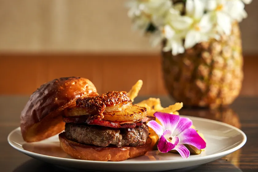 プライムビーフ100%のパティを使用、こんがり焼いた香ばしいパティに、香ばしく甘酸っぱいグリルしたパイナップルとベーコン。唐辛子、コリアンダー、クミンなどスパイスや胡麻、ガーリックで作ったエキゾチックな味のハリッサソースで食べるプレミアムバーガーです。
