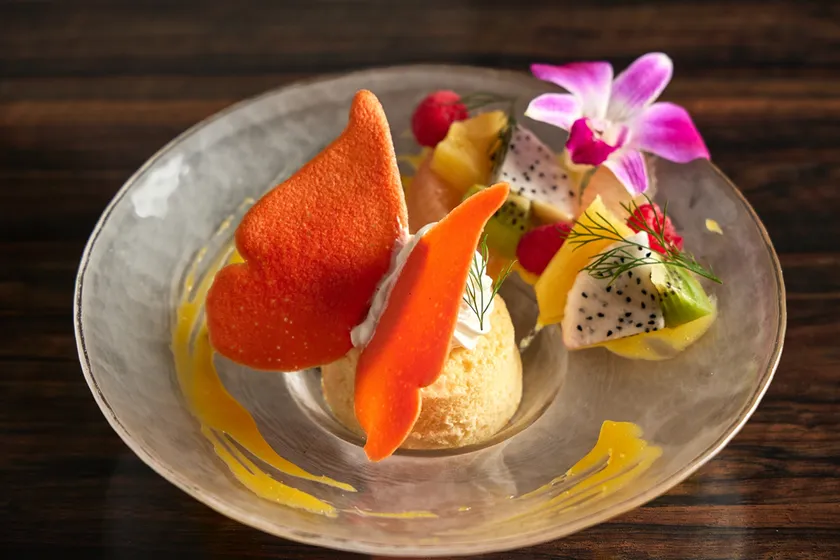 スフレチーズケーキに、リリコイ(パッションフルーツ)ソースとトロピカルなフルーツを添えて レイの花に誘われた蝶をモチーフにしました。