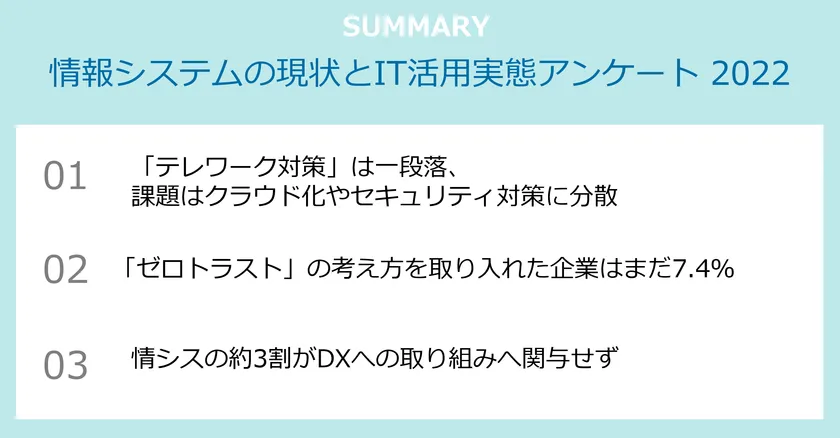 「情報システムの現状とIT活用実態アンケート 2022」を公開 ~企業のテレワーク対策は一段落。 今後はセキュリティ対策やDX推進の準備期へ~