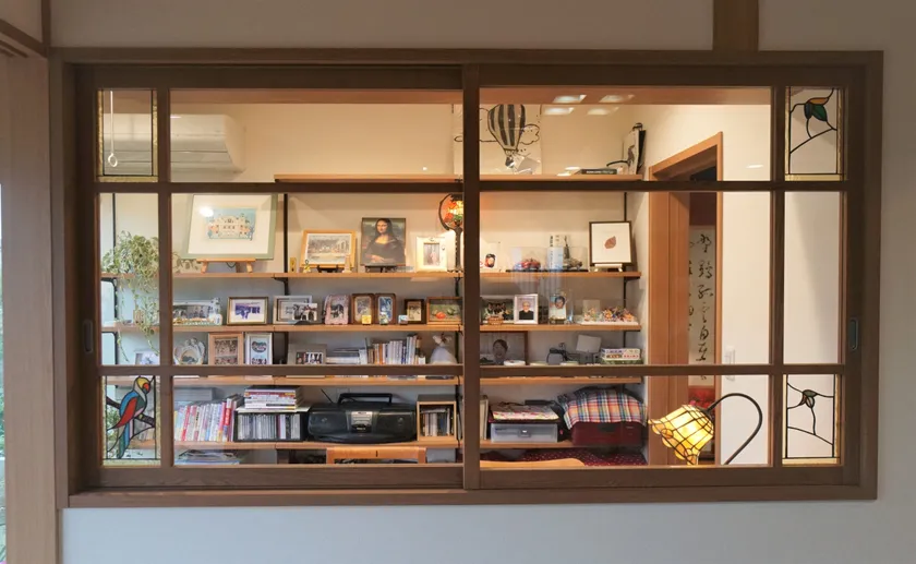 リフォームは普段使わない部屋の部分改装という形で進められ、由美子さんの工房も長い間、荷物置き場となっていたダイニングに隣接する和室(奥の間)を改装したものです。工房には由美子さんの作品が飾られ、大きなガラス窓で仕切られたダイニングからも作業の様子や作品を見ることができるようになっています。工房とダイニングを仕切る窓ガラスをよく見ると…。ガラス窓の四方にステンドグラスがはめ込まれていますが、これは由美子さんの亡きお母様の手作りです。このリフォームには、いたるところに家族の思い出がちりばめられています。