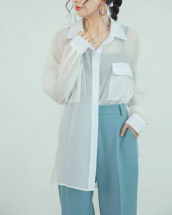 フロントポケットがアクセントのシースルーシャツのような1枚。前を開けてラフに着こなすスタイルもおすすめ。