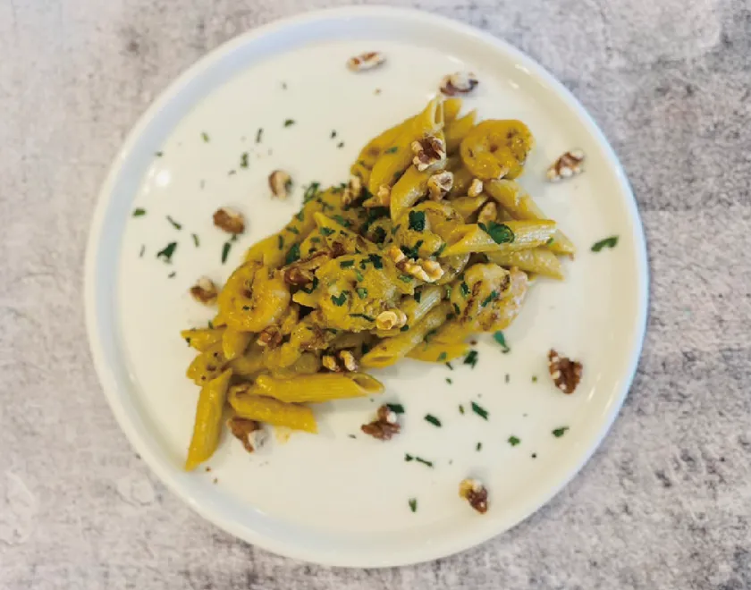 くるみとエビ、ズッキニのペンネ