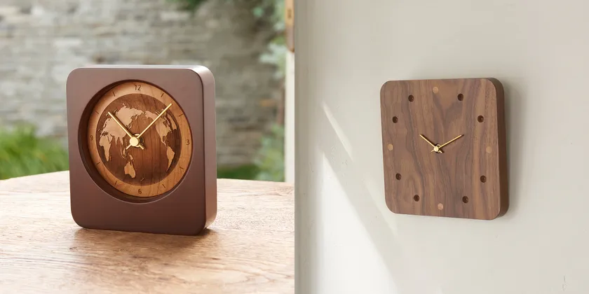 置時計 ワールド(左)、掛け時計 ウォールナット(右)