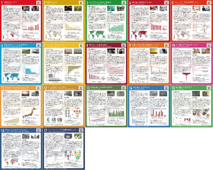 「SDGsスタディパネル」は、SDGsのゴールごとに、関連するキーワードや世界と日本の現状がまとめられた計17枚のパネルです。教育現場はもちろんのこと、あらゆる分野の皆様のSDGs理解促進にもご活用いただけます。