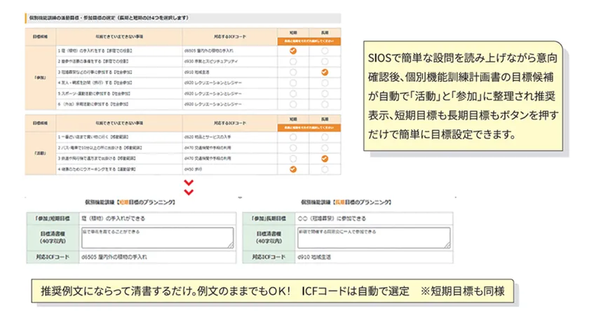 □利用者の意向から「心身機能」、「活動」、「参加」の短期長期計6つの目標設定が半自動で作成可能になります