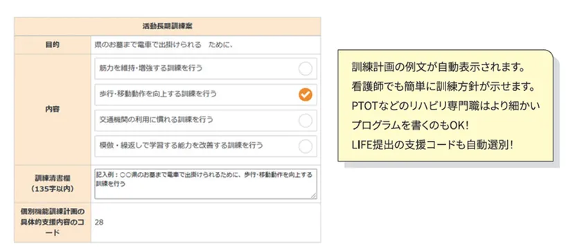 □訓練計画の例文が自動表示されるので、看護師配置のみでも簡単に訓練方針を示してくれます