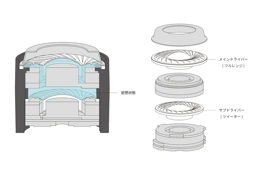 一般的にマルチドライバー構造は、各振動板の振幅誤差によって出力される音に歪みが生じやすいという課題があります。「Synchro Motion Driver」はメインドライバーとサブドライバーの間を密閉に近い状態にする特殊構造により、二つの振動板の振幅の同期性を高めることで音の歪みを抑制します。デュアルダイナミックドライバー特有の、重厚な低音と濁りがなく繊細でキレのある中高音を再生します。