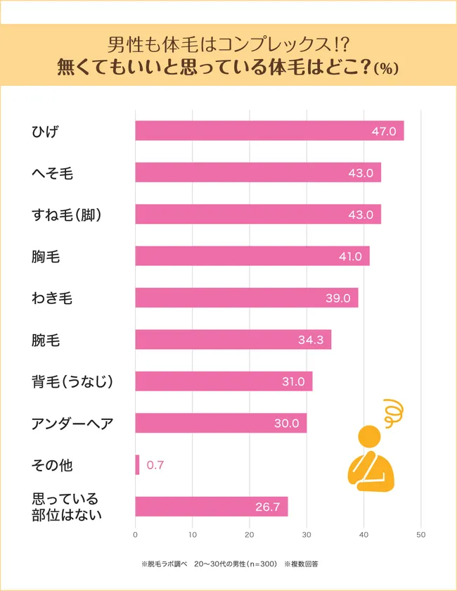 なくてもいいと「思っている部位はない」と回答した男性も26.7%いましたが、多くの男性は頻繁なお手入れから解放されたかったり、どこかしらの体毛が不要だと思ったりしているようです。