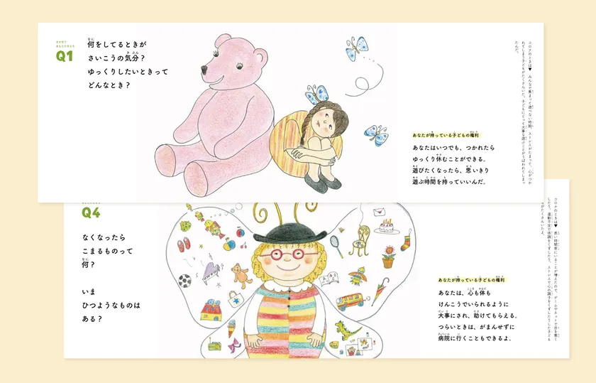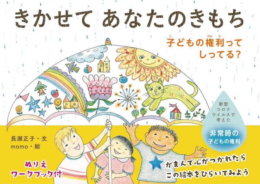 「コロナ下で考えた非常時の子どもの権利」という言葉が表紙にかかれています。非常時に子どもが気持ちを押し込めてしまうことの危険性、気持ちを表に出すことの大切さを感じている長瀬さんは、子どもの気持ちを聴くことが「子どもの権利」を考える上で欠かせない、最も大切な視点であるといいます。この絵本は、その視点に重点をおいたワーク型絵本の形をとり、自分の気持ちと向き合う中で、「子どもの権利」についてまなべる仕組みになっています。