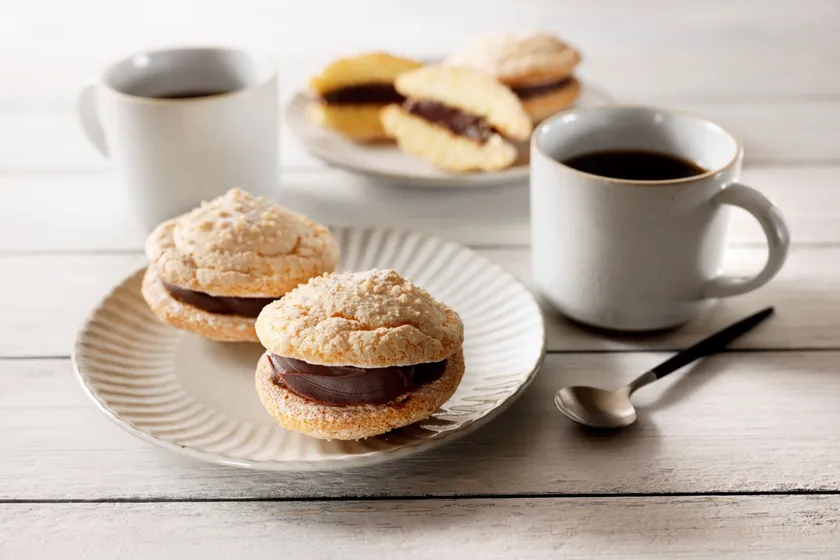 外はさっくり中はふんわりとした軽い食感の生地に、濃厚なチョコレートクリームをサンドしてお召し上がりください。お好きなジャムや生クリームをサンドしてもお楽しみいただけます。