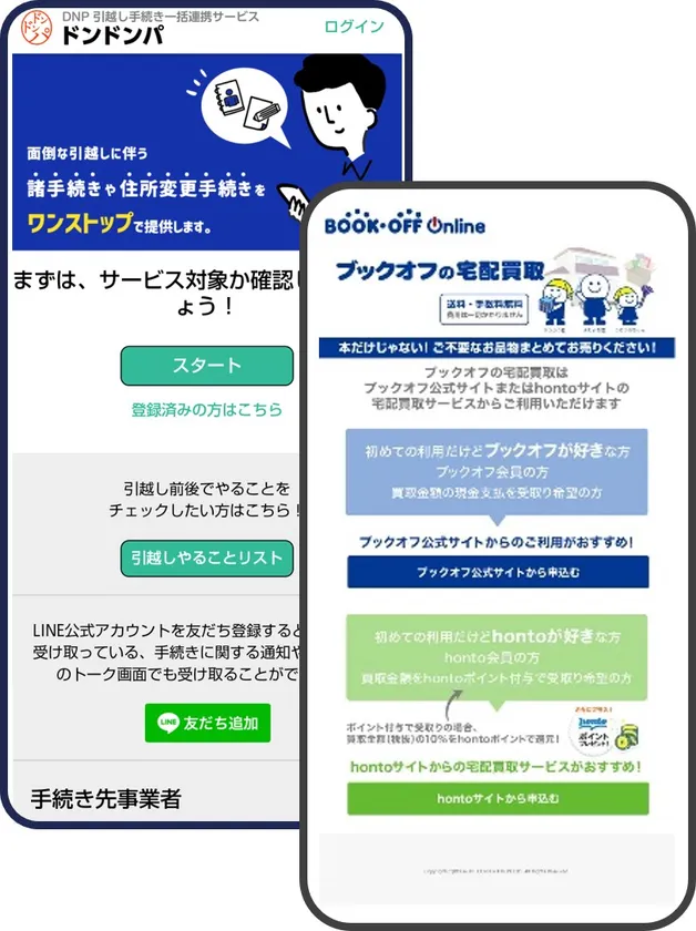 「ドンドンパ」のウェブサイトで、引越しの前・後の住所や予定日を入力すると、同時期に手続き可能なサービスとして、ブックオフの「宅配買取サービス」が表示されます。希望者がこのサービスを選択すると、手続き用のウェブサイトに遷移し、宅配買取の手続きを進めることができます。