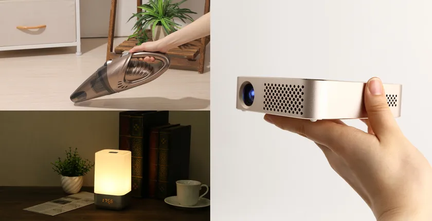 左上/持ちやすいハンディ掃除機、左下/光目覚まし時計兼授乳ライト、右/明るい小型プロジェクター