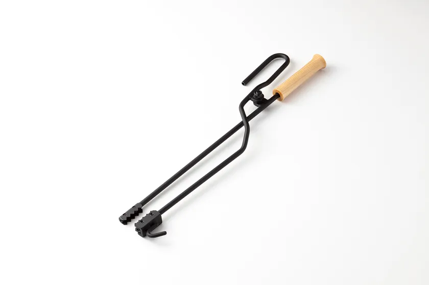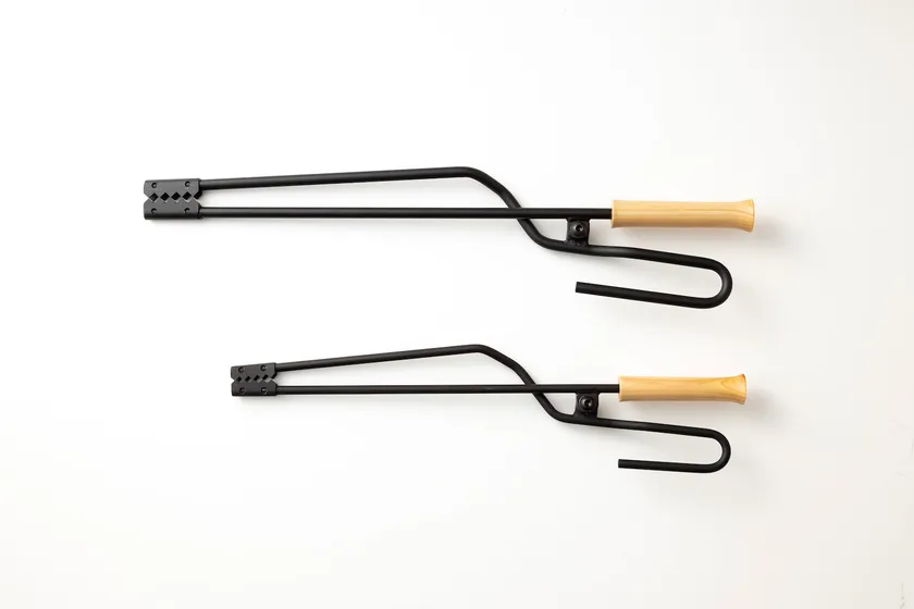 空気を送る火吹き棒と、薪を操作する火バサミの機能を兼ね備えており、オプションのフックと灰かきを装着すると、引っ掛ける&かき出す機能も加わります。金属加工専門職人たちが全てハンドメイドで製作。