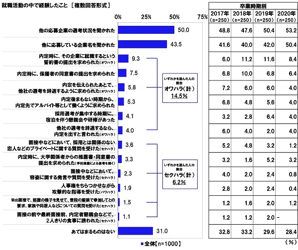 全回答者(1,000名)に、就職活動の中で経験したことを聞いたところ、「他の応募企業の選考状況を聞かれた」(50.0%)と「他に応募している企業名を聞かれた」(43.5%)が突出して高くなりました。次いで高くなったのは、「内定時に、その企業に就職するという誓約書の提出を求められた(オワハラ)」(9.3%)、「内定時に、保護者の同意書の提出を求められた」(7.5%)、「内定を伝えられたあとで、他社の選考を辞退するように求められた(オワハラ)」(5.8%)でした。また、“オワハラ”を受けた人の割合は14.5%、“セクハラ”を受けた人の割合は6.2%でした。内定の際に就職活動を終了し自社に入社するよう圧力をかけられる“オワハラ”や、容姿に関する発言・質問や2人きりの食事に誘う行為など“セクハラ”を受けた人がいることが明らかになりました。