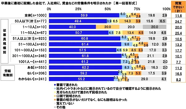 卒業後に最初に就職した会社で、入社時に、賃金などの労働条件を明示されたか聞いたところ、「書面で渡された」は59.9%、「社内イントラネットなどに掲示されているので自分で確認するように指示された」は6.0%となりました。また、「見せられただけで渡されず回収された」は3.4%、「口頭で説明された」は5.4%、「書面の明示がないだけでなく、なにも説明はなかった」は2.8%で、労働条件を書面や情報ファイルなどの形で常時閲覧することができない状況の人(以下、『閲覧できない(計)』)の割合は、合計で11.6%となりました。