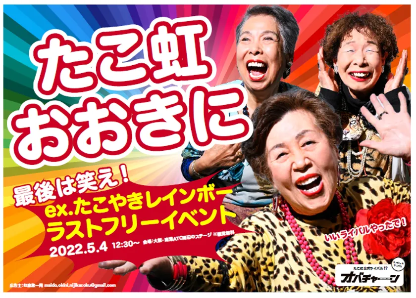 目立ってなんぼや!大阪のオバちゃんもビックリ!? 超ド派手すぎる応援広告! 元たこやきレインボー5人にファンから本気のエールを! Twitter連動の大喜利企画や「オバチャーン」も友情出演!?