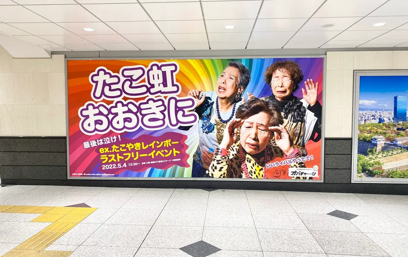●最近見かけることが増えてきた応援広告。全国各地の媒体枠と連動した広告が掲出されるなど大規模なものも少なくありませんが、今回は大阪を拠点に活動してきたたこやきレインボーらしく、大阪駅構内のビッグビジュアルにて同時期に3箇所の応援広告を掲出いたします。「たこやきレインボー」という最高のアイドルがいたこと、そしてそのラストステージである5月4日(水・祝)のラストフリーイベントを、「目立ってなんぼ!」の関西魂でとにかくド派手に告知します。