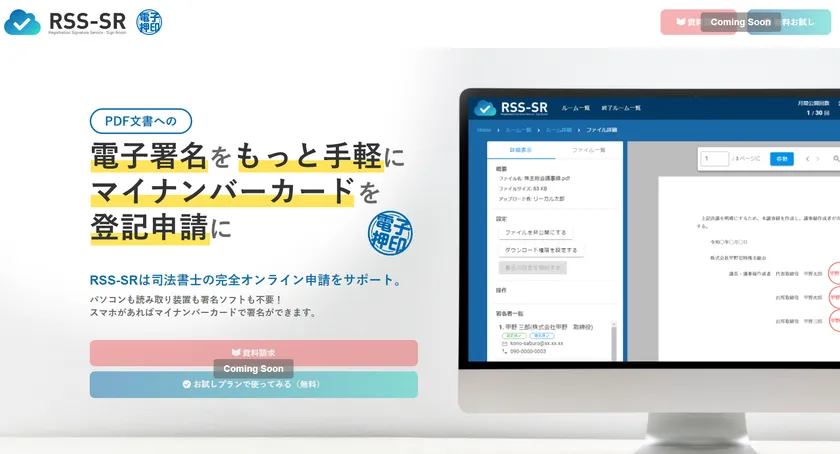 そこで添付書類も電子化した登記申請の完全オンライン申請を支援するために、司法書士が作成した書類に特別な機器を使わずにマイナンバーカードで電子署名ができるクラウドサービス「RSS-SR」を開発いたしました。