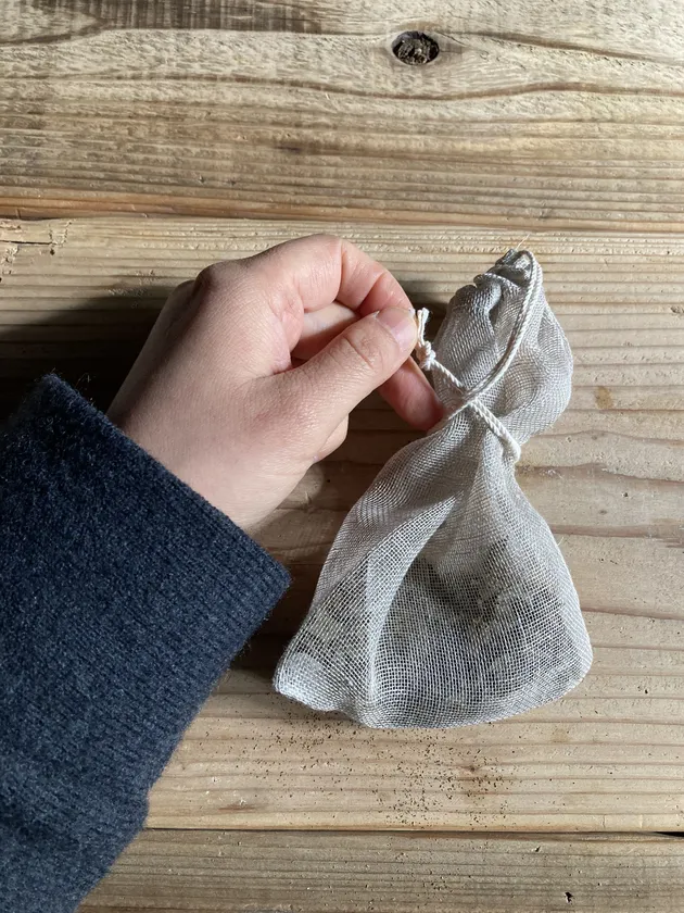 茶葉を入れて巾着をしぼり、ヒモをくるっと巻けば茶葉が出てくるのを防げます。使った後は、茶殻を取り出して、手洗いし、さっと風通しの良いところにかけて自然乾燥するだけ。