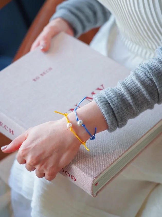 コードブレスレットを作る過程では、玉結び・止め結びを行います。結ぶという行為には、願いや縁を繋げる意味合いがあるので、ウクライナの国旗と同じカラーの紐を結ぶ際には、「平和への願い」を一緒に結んでいただけたらと思います。